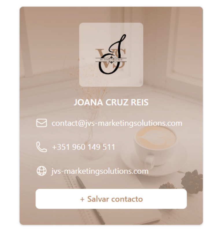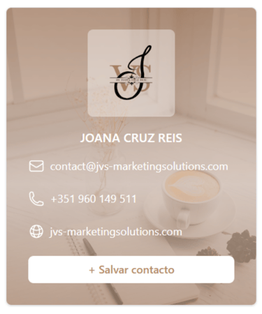 Melhor Conectividade & Engajamento: Permite que os seus clientes e parceiros adicionem-o diretamente aos contactos, interajam com as suas redes sociais e acedam ao seu website com um só clique.